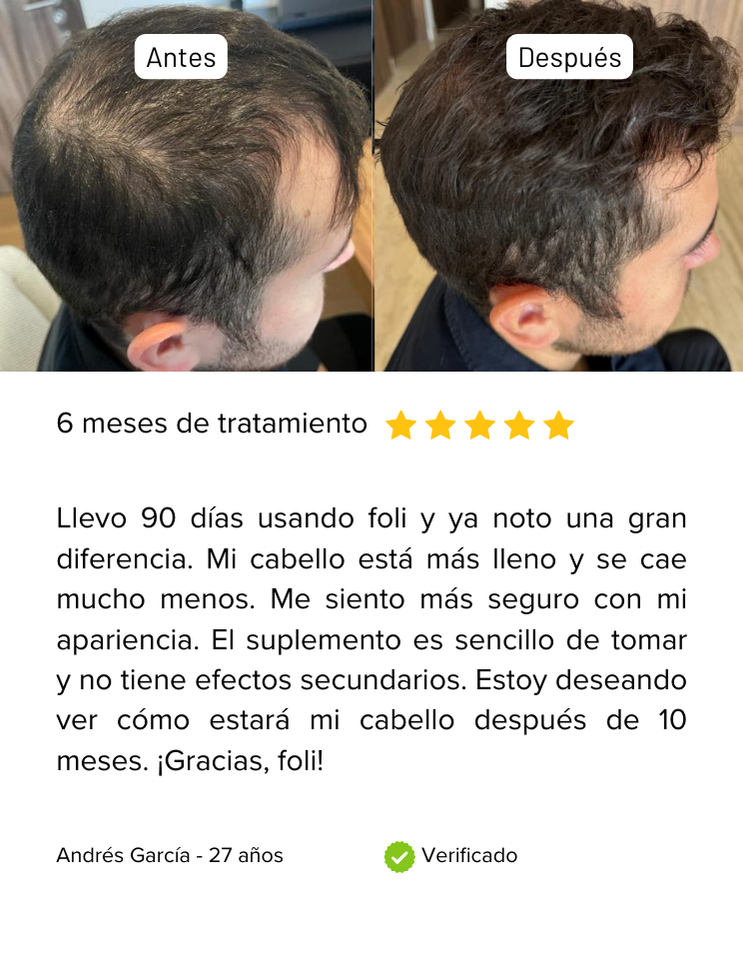 Con foli® Andrés pudo recuperar su cabello en menos de 6 meses de tratamiento, simplemente tomando una cápsula al día!