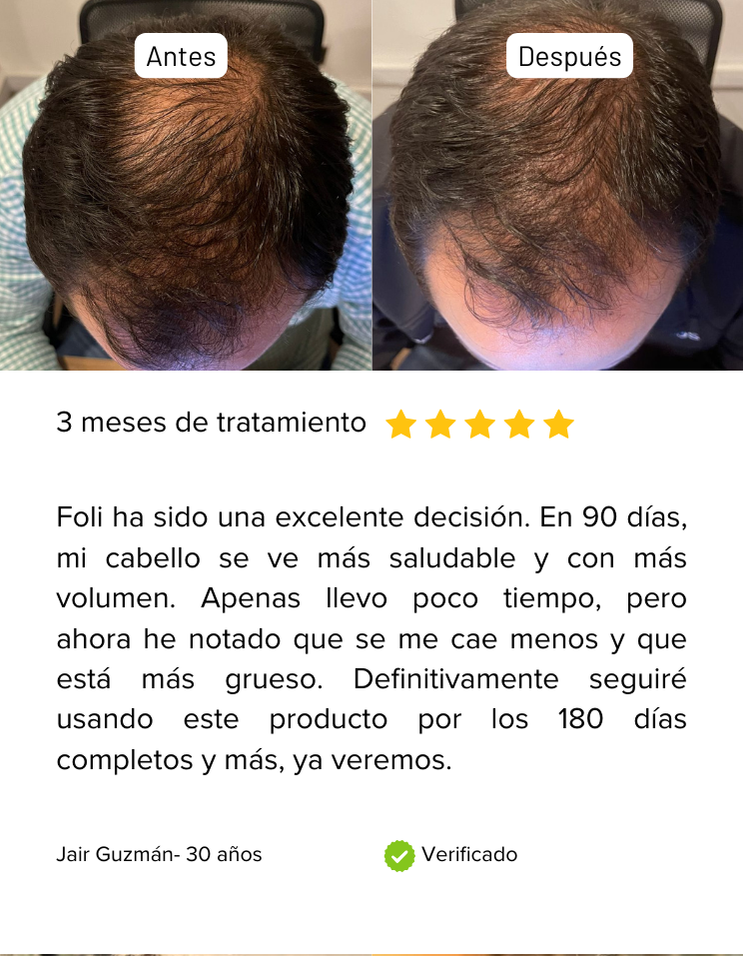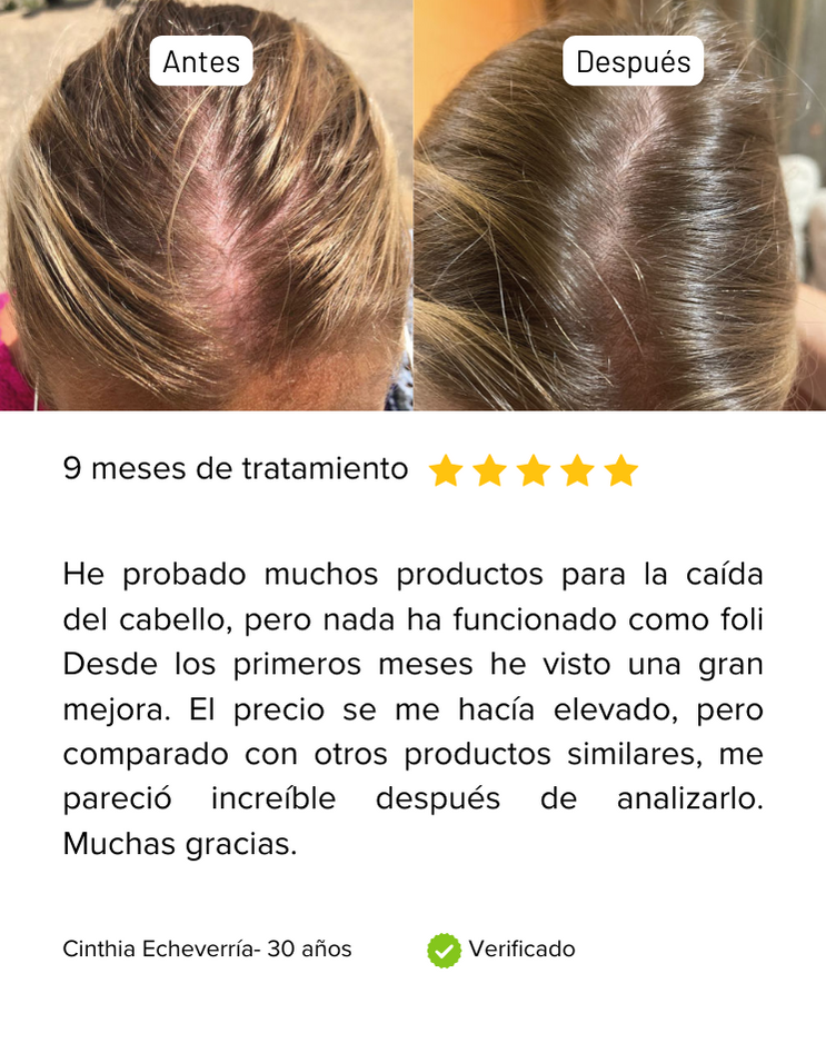 foli™ es una fórmula que requiere de uso constante para mantener y mejorar los resultados. Los primeros resultados visibles los notarás entre los 3 a 6 meses de uso constante, pero varía de una persona a otra, sé paciente y no dejes de usarlo.
